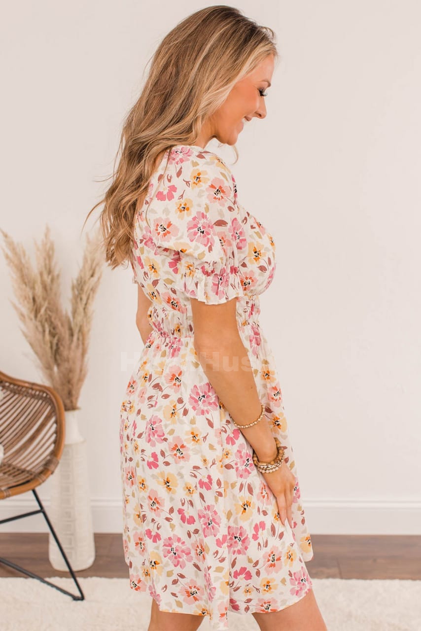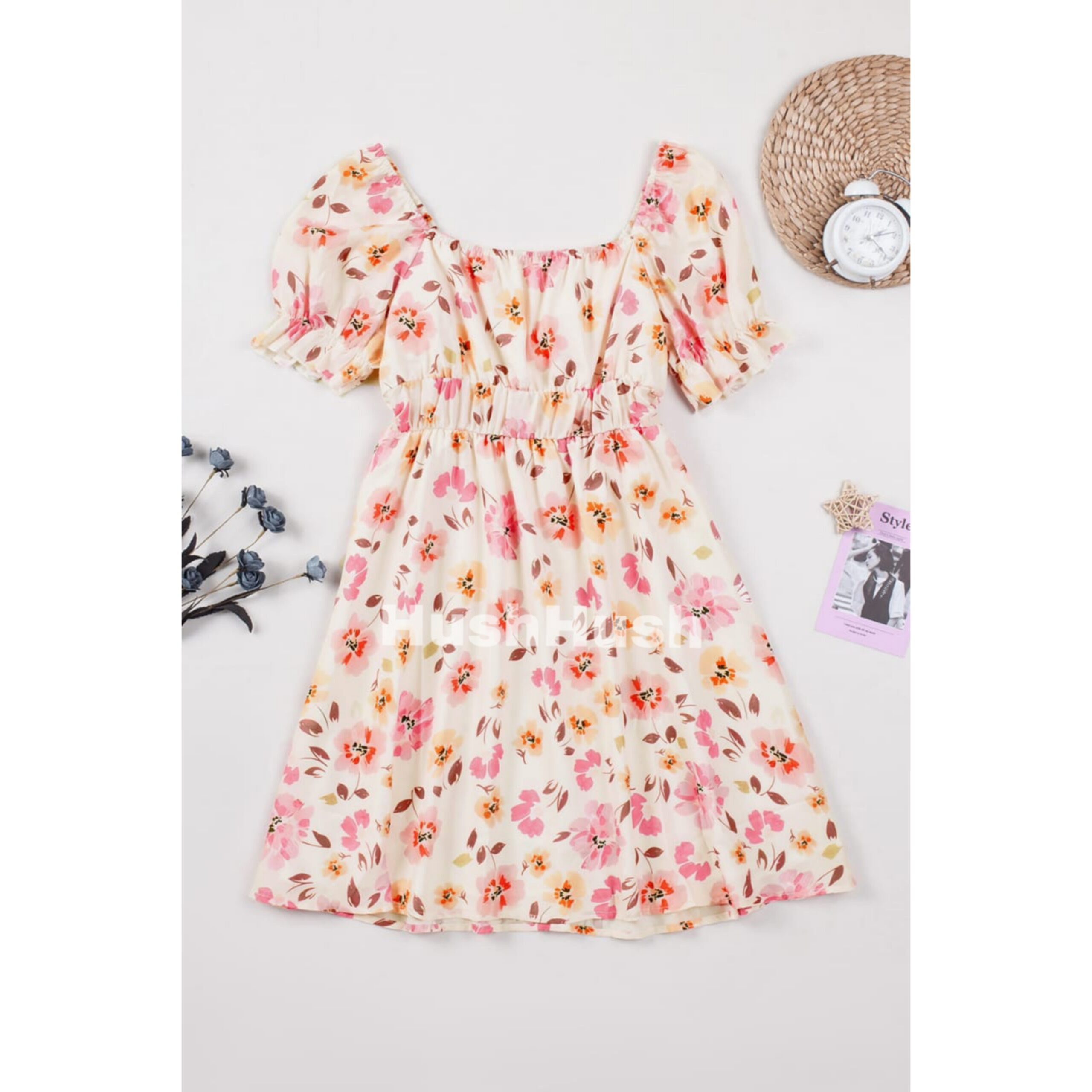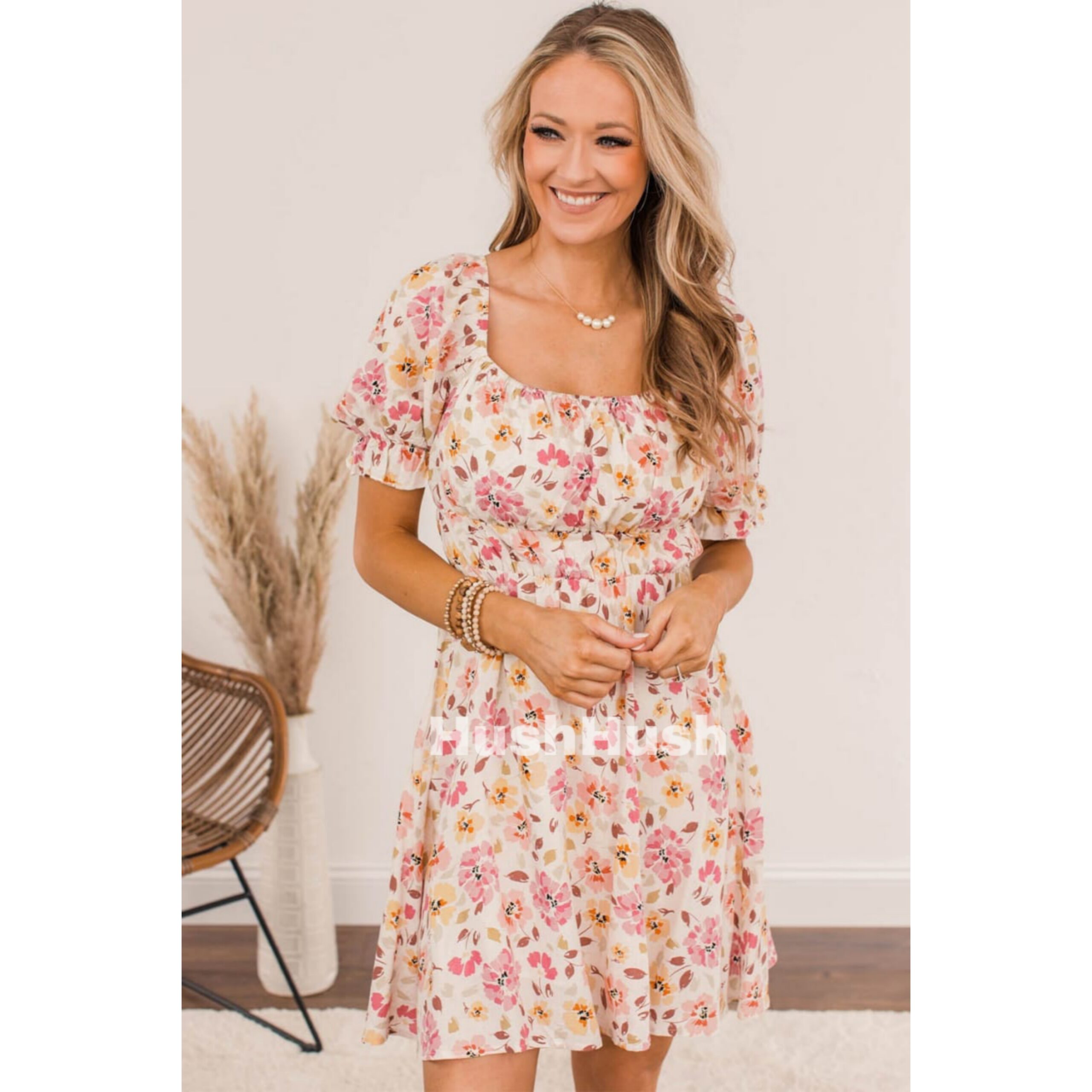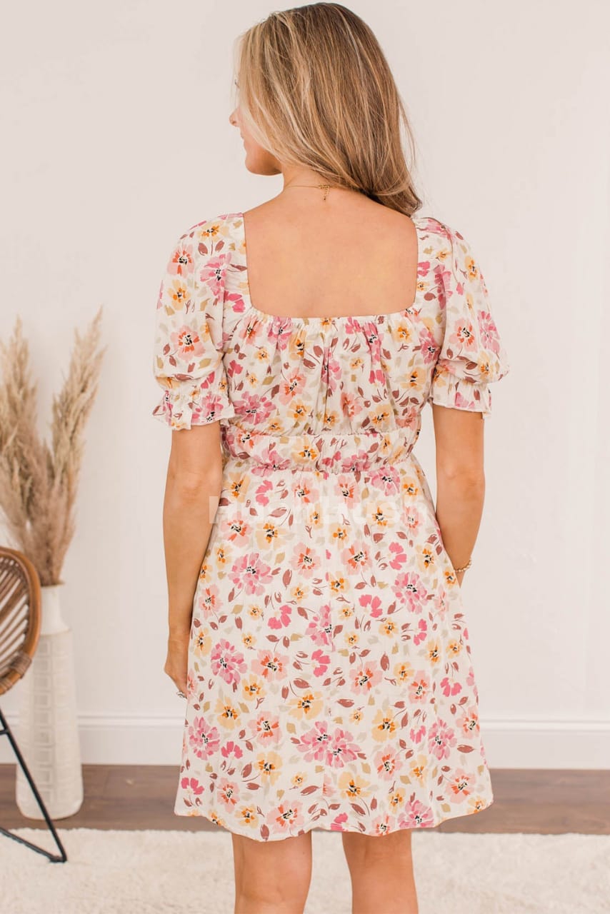 Beige Square Neck Puff Short Sleeve Floral Dress