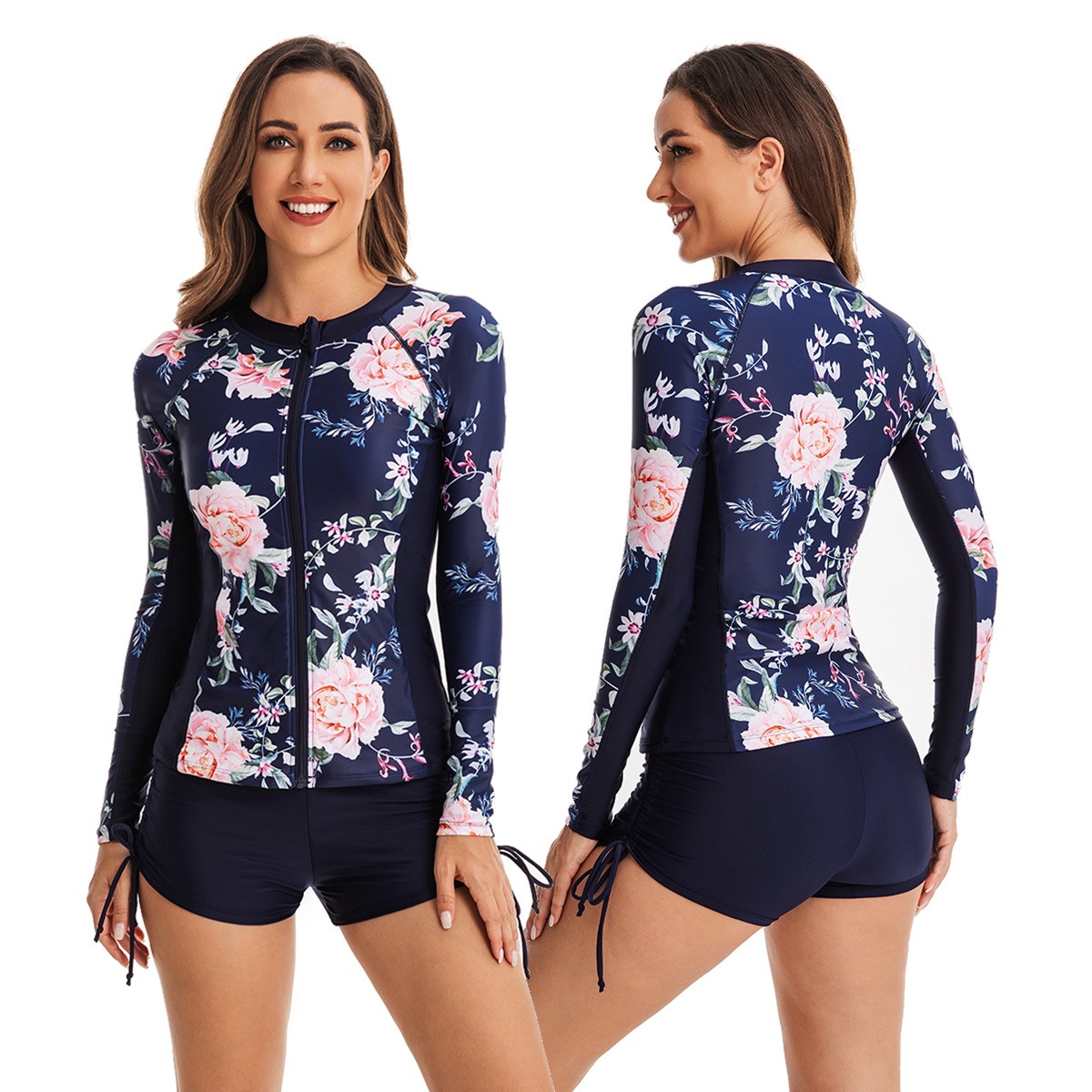 Flower detail Color Block Zipper Long Sleeve Swimsuit