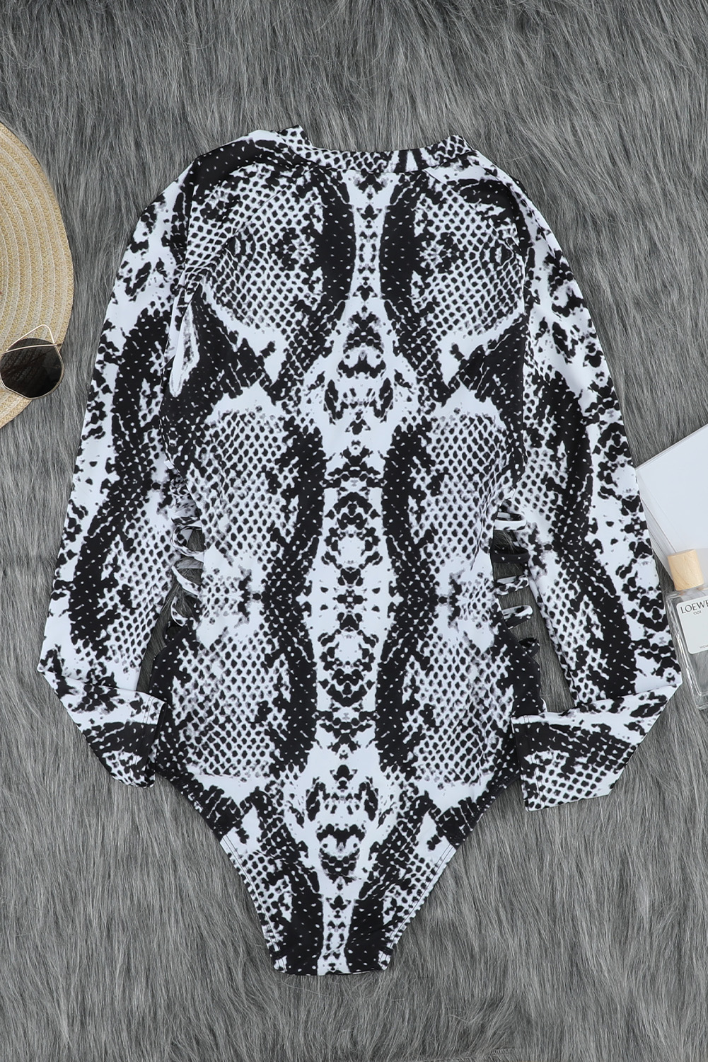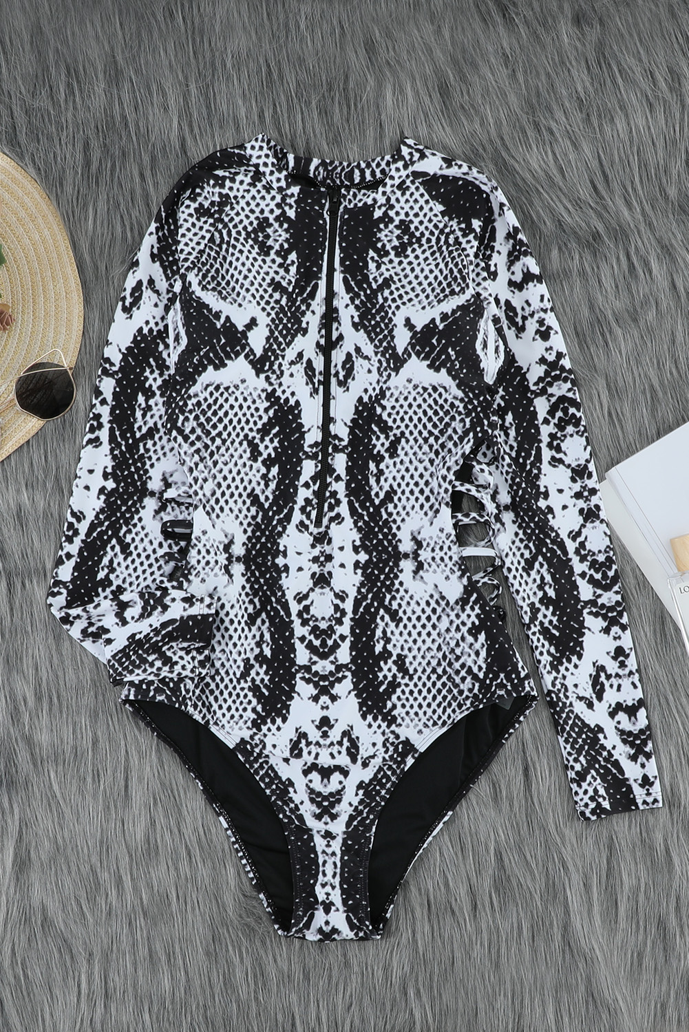 Gray Snake Print Zipper Cut-out Rash Guard Swimsuit