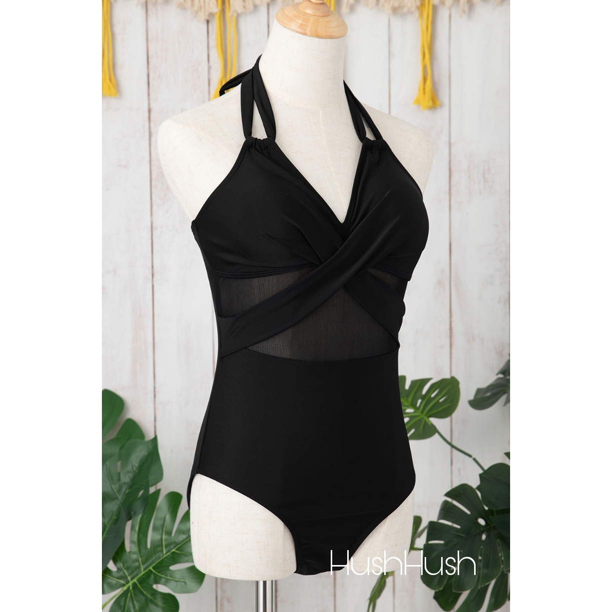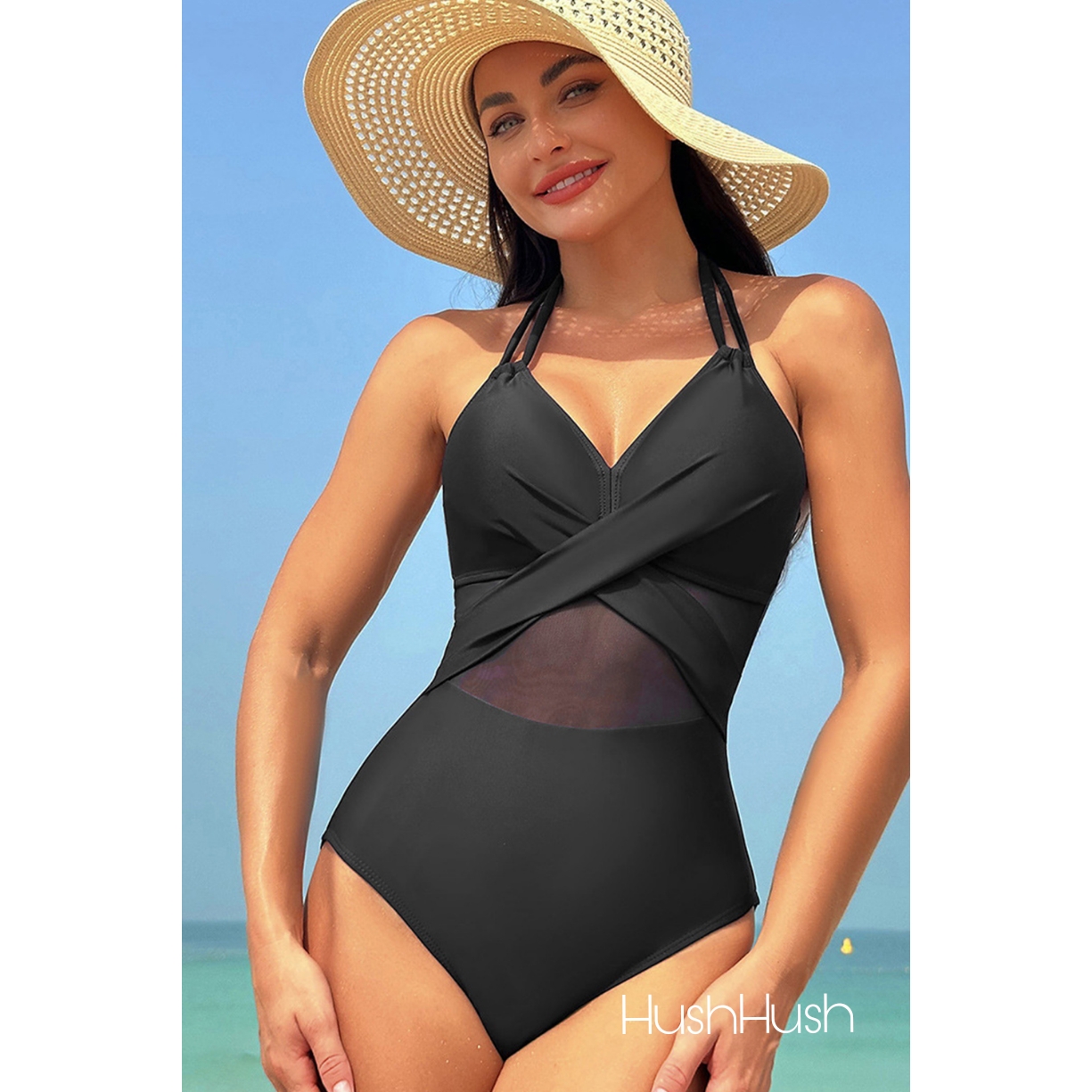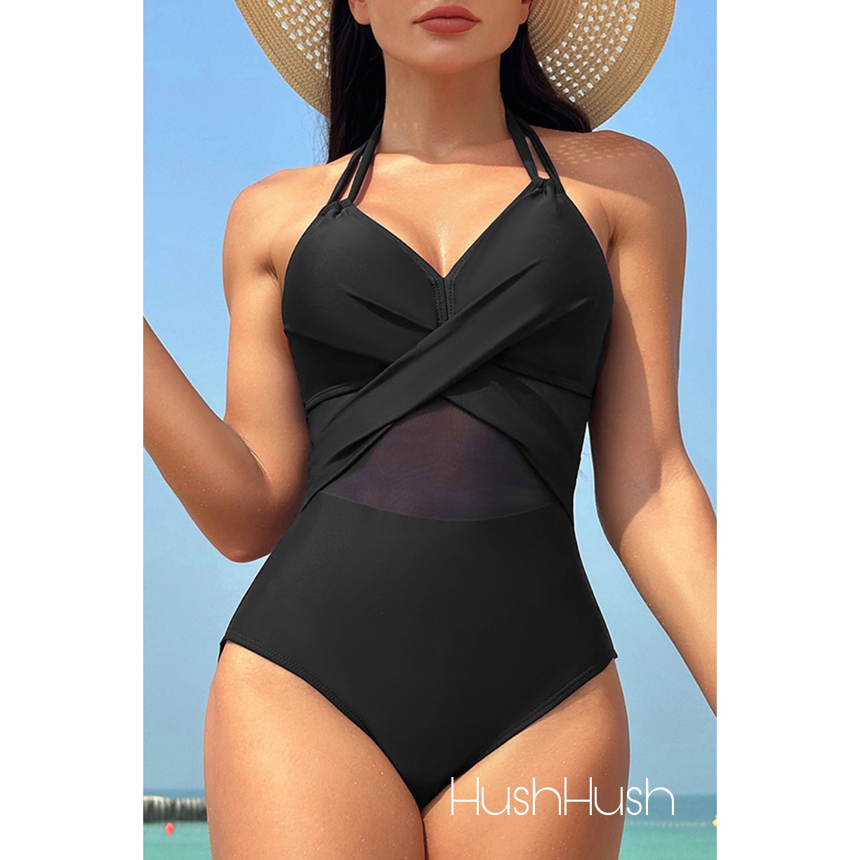 Black Halter Mesh Insert Cross Front One-Piece Swimsuit Halter Mesh Insert Cross Front One-Piece Swimsuit