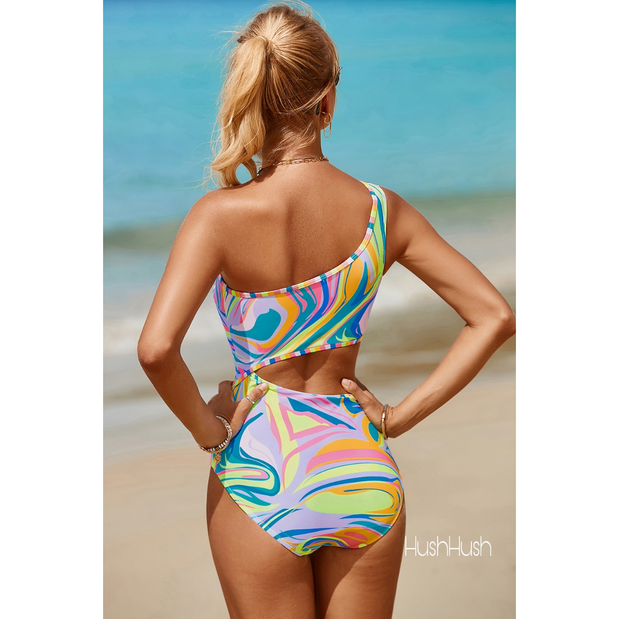 Multicolor Abstract Swirl Print Asymmetric Cutout One Piece Swimsuit
