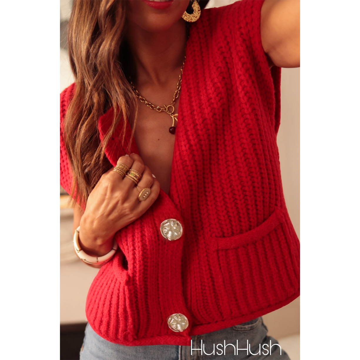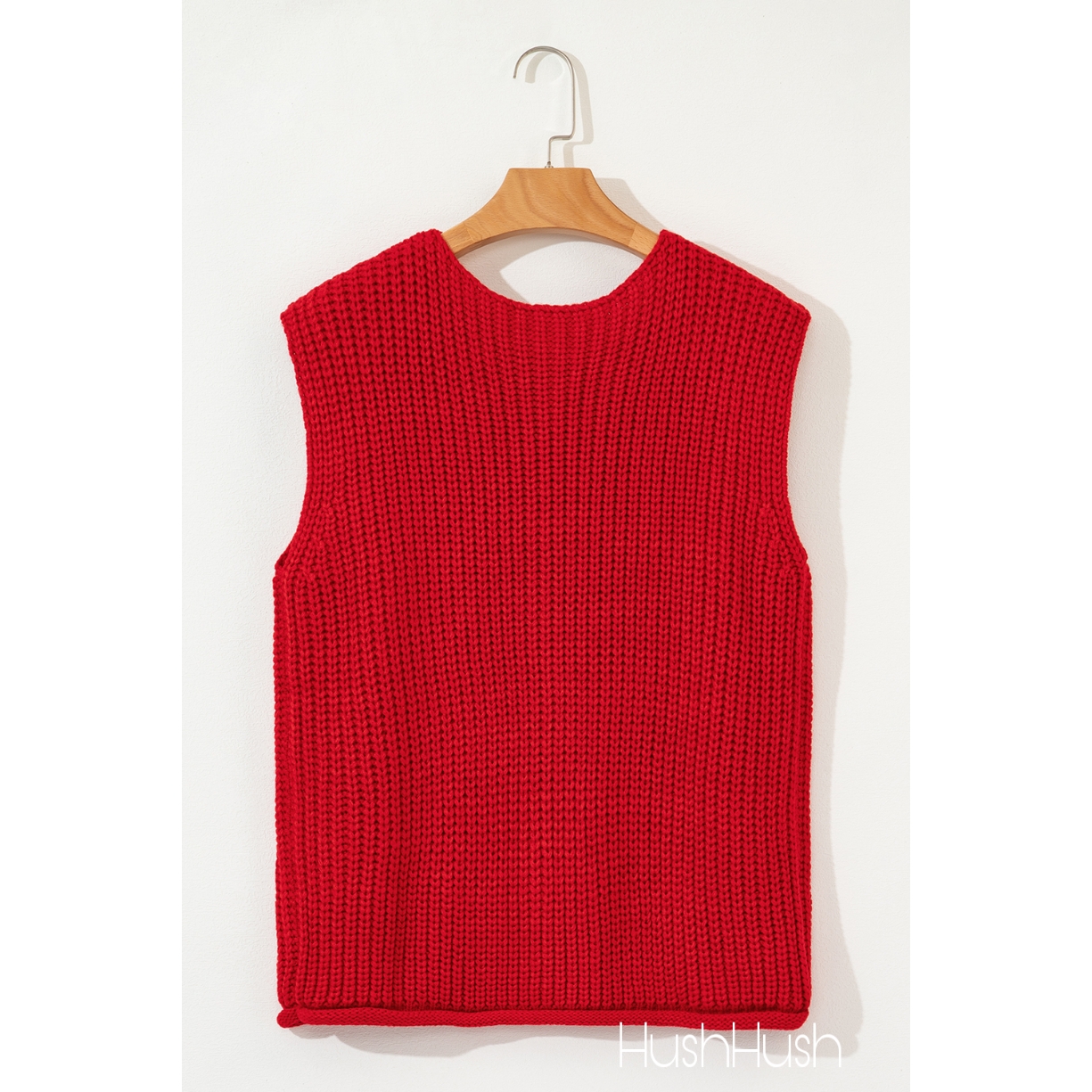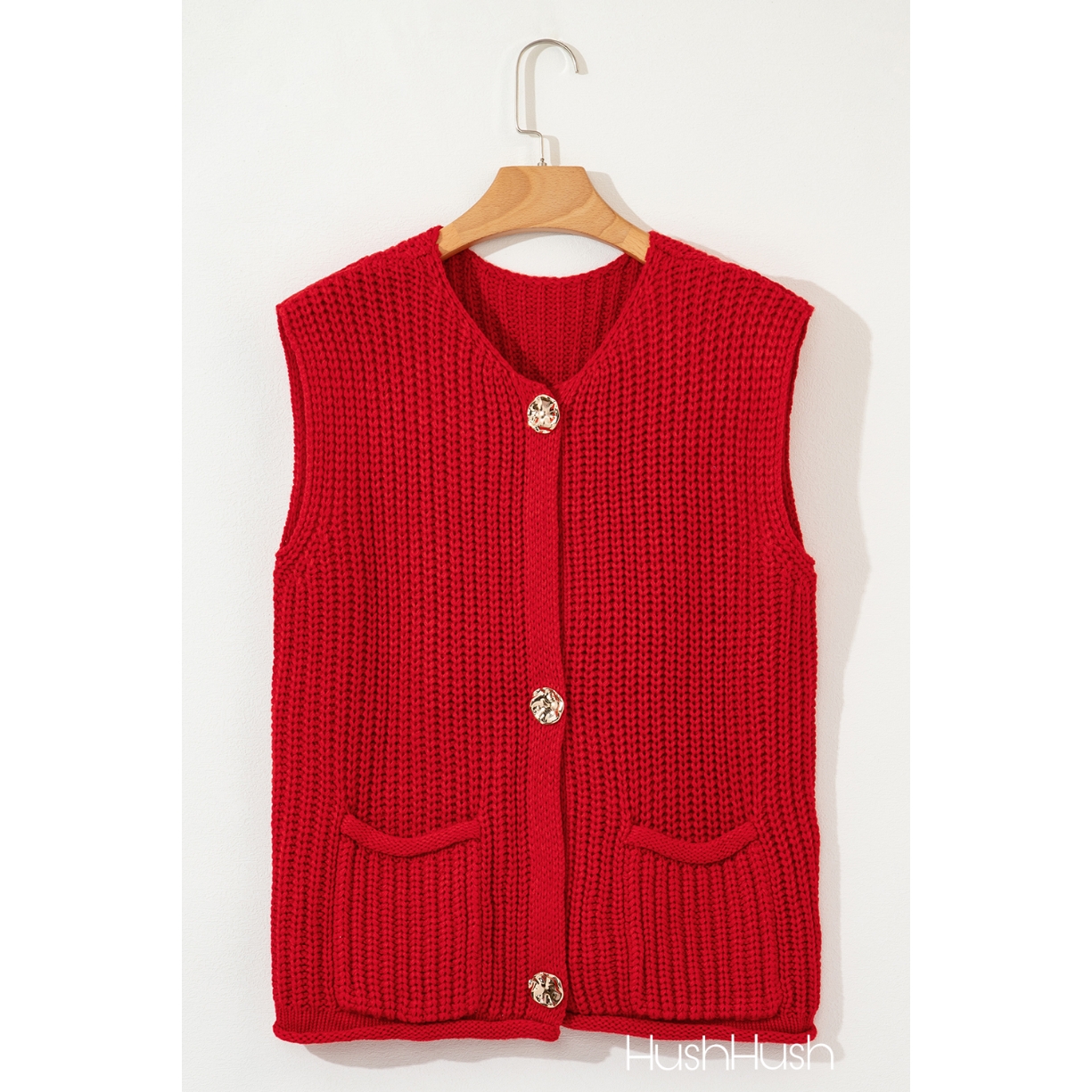 Red Solid Textured Knit Side Pockets Buttoned Sweater Vest