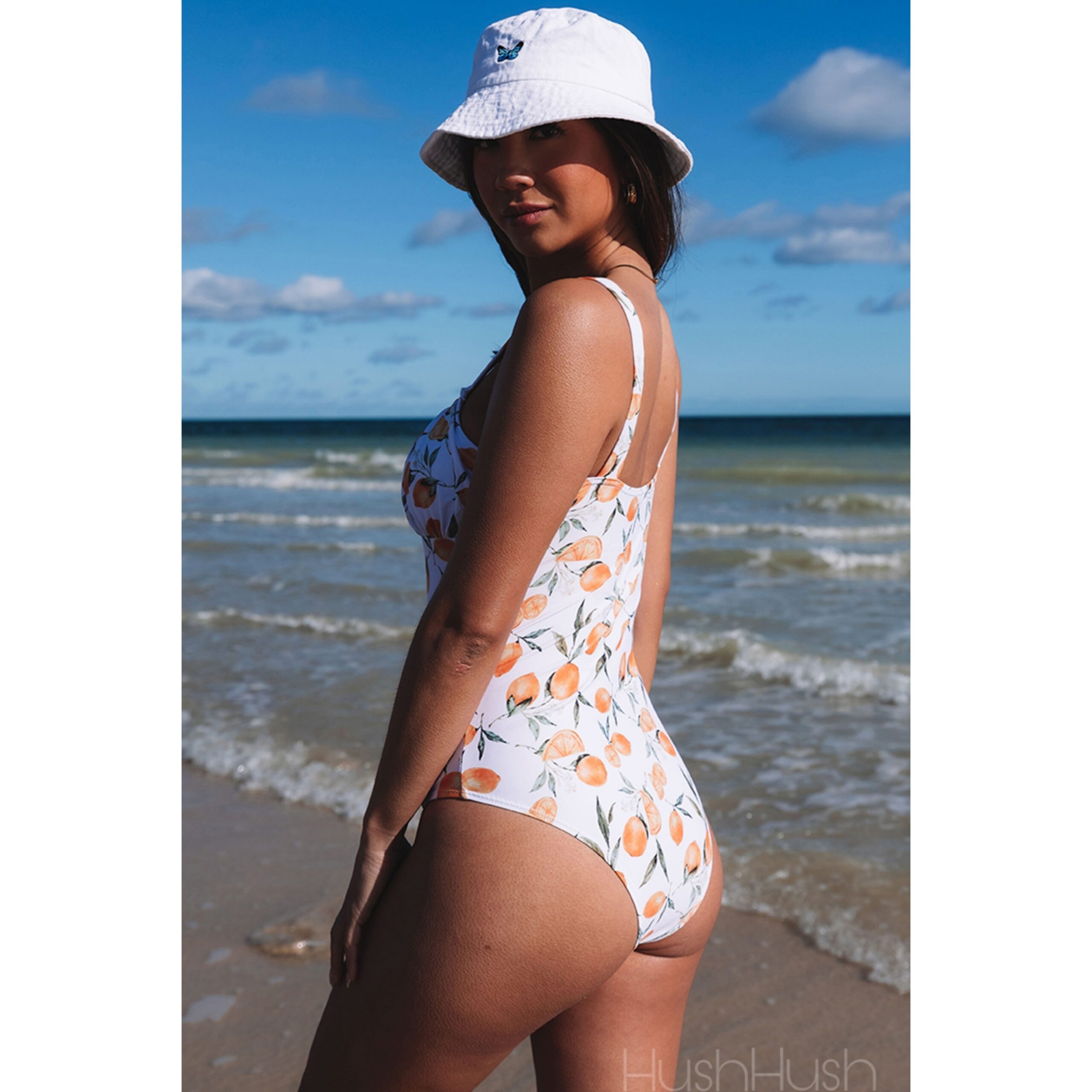 White Fruit Pattern Print Ruched One-piece Swimsuit